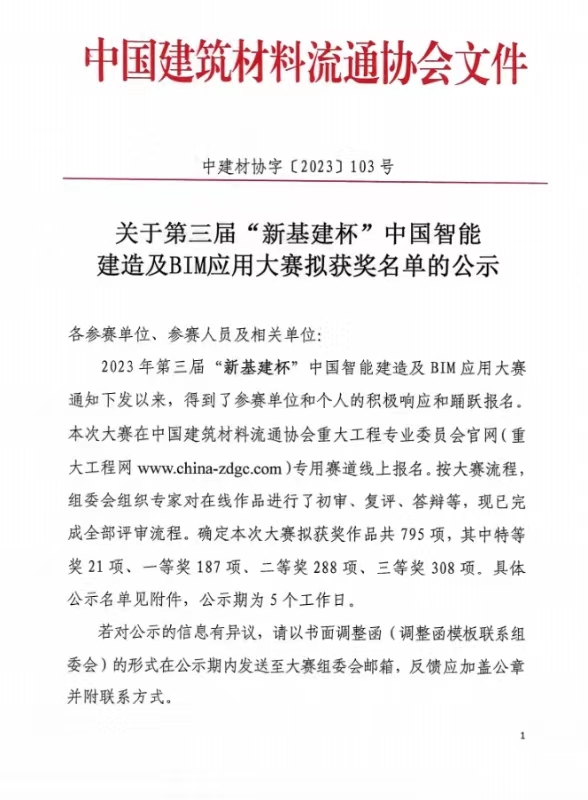榮獲第三屆“新基建杯”中國智能建造及BIM應(yīng)用大賽