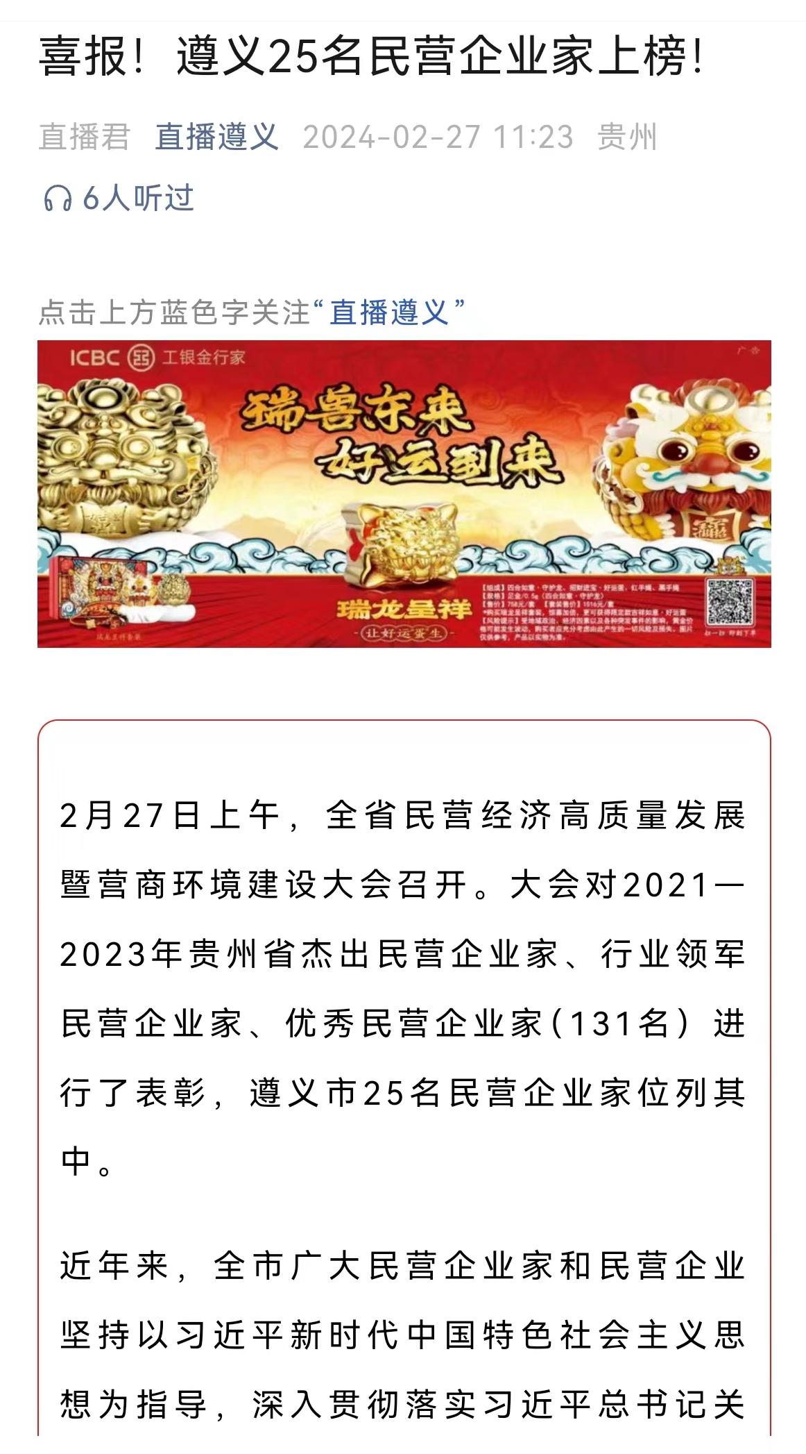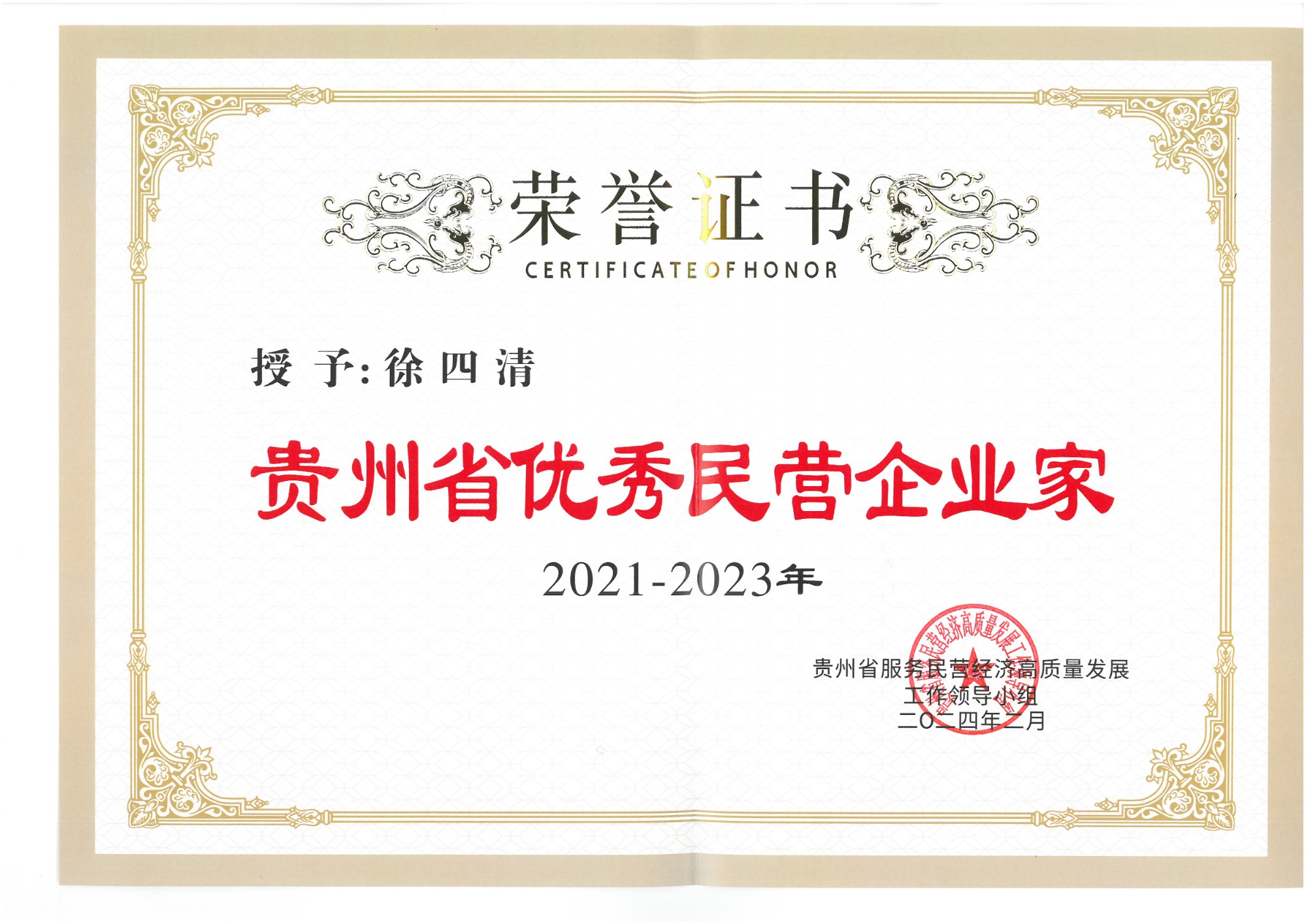 2月27日上午,全省民營經(jīng)濟(jì)高質(zhì)量發(fā)展暨營商環(huán)境建設(shè)大會召開。大會對2021—2023年貴州省杰出民營企業(yè)家、行業(yè)領(lǐng)軍民營企業(yè)家、優(yōu)秀民營企業(yè)家(131名)進(jìn)行了表彰。遵義建工(集團(tuán))有限公司董事長徐四清榮獲“貴州省優(yōu)秀民營企業(yè)家”稱號。