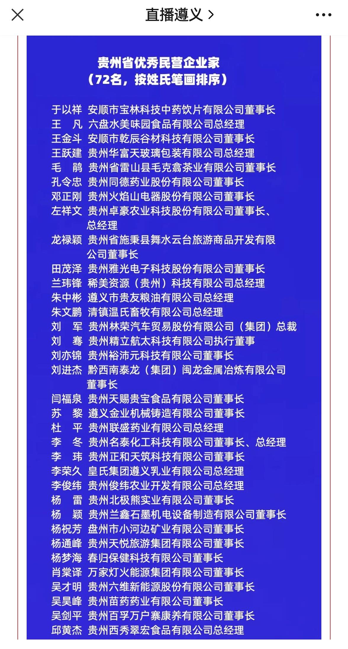 百舸爭流勇當(dāng)先,蹄疾穩(wěn)步行更遠(yuǎn)。此次入選貴州省優(yōu)秀民營企業(yè)家,是各級政府和社會各界對徐四清董事長優(yōu)秀企業(yè)家精神的認(rèn)可,是對遵義建工(集團(tuán))有限公司助力貴州省經(jīng)濟(jì)高質(zhì)量持續(xù)健康發(fā)展和勇于擔(dān)當(dāng)踐行社會責(zé)任的肯定和褒獎。徐四清董事長表示,對省委省政府給予民營企業(yè)、給予遵義建工(集團(tuán))有限公司的榮譽表示感謝。遵義建工(集團(tuán))有限公司將緊跟國家經(jīng)濟(jì)發(fā)展政策和產(chǎn)業(yè)未來發(fā)展走向,踐行綠色發(fā)展理念,積極履行社會責(zé)任,充分發(fā)揮優(yōu)秀民營企業(yè)家的模范示范作用,落實企業(yè)高質(zhì)量發(fā)展,為推動貴州省經(jīng)濟(jì)高質(zhì)量發(fā)展做出更大的貢獻(xiàn)。